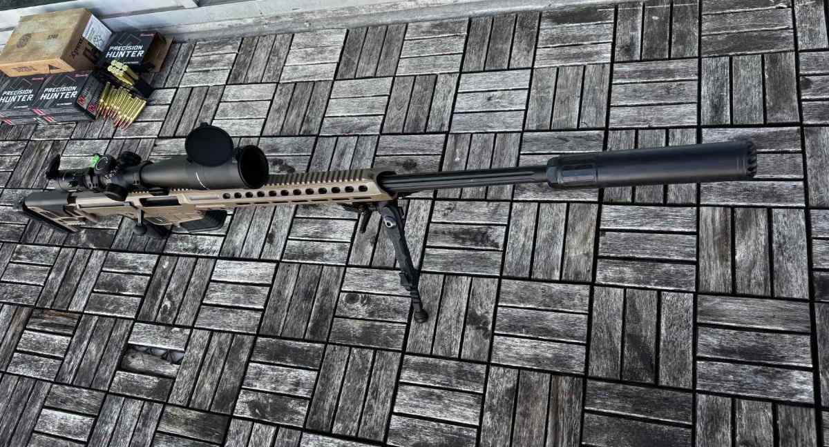 Included in the package are approximately 300 rounds of Hornady .338 Lapua 270-grain ELD-X ammunition, the Leupold Mark 5HD optic with Tremor 3 reticle, scope mount, bubble level, muzzle brake. The configuration represents a complete long-range rifle system combining rifle, optic, and matched accessories for extended-distance shooting applications.
